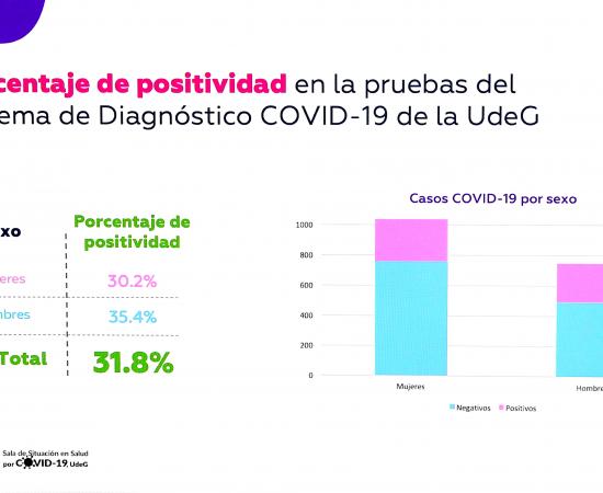 La doctora Gabriela Macedo Ojeda, Coordinadora Ejecutiva de la Sala de Situación en Salud por COVID-19, afirmó que en cuanto al porcentaje de positividad en las pruebas del sistema de diagnóstico COVID-19 de la Universidad de Guadalajara, se tiene un 31.8 por ciento. En mujeres es del 30.2 por ciento y en hombres, del 35.4 por ciento.
