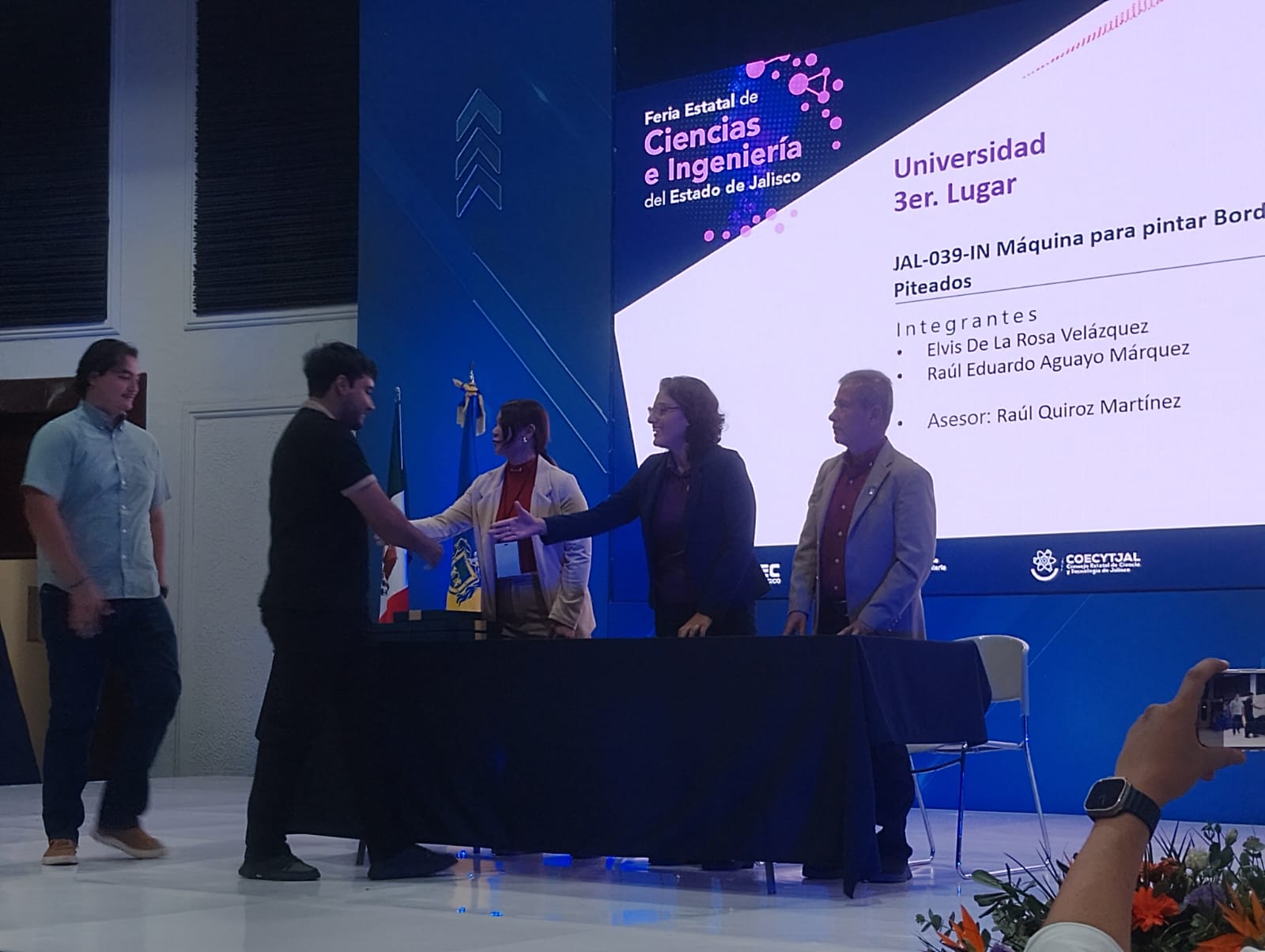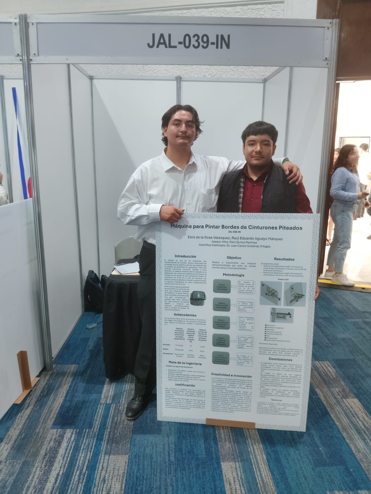 Los alumnos Elvis de la Rosa Vázquez y Raúl Eduardo Aguayo Márquez, de séptimo semestre de la Ingeniería Mecánica Eléctrica del Centro Universitario del Norte (CUNorte), obtuvieron el tercer lugar en la Feria Estatal de Ciencias e Ingeniería de Jalisco (FECIJal) 2025, con el proyecto “Máquina para pintar bordes de cinturones piteados”, desarrollado bajo la asesoría del Mtro. Raúl Quiroz Martínez.