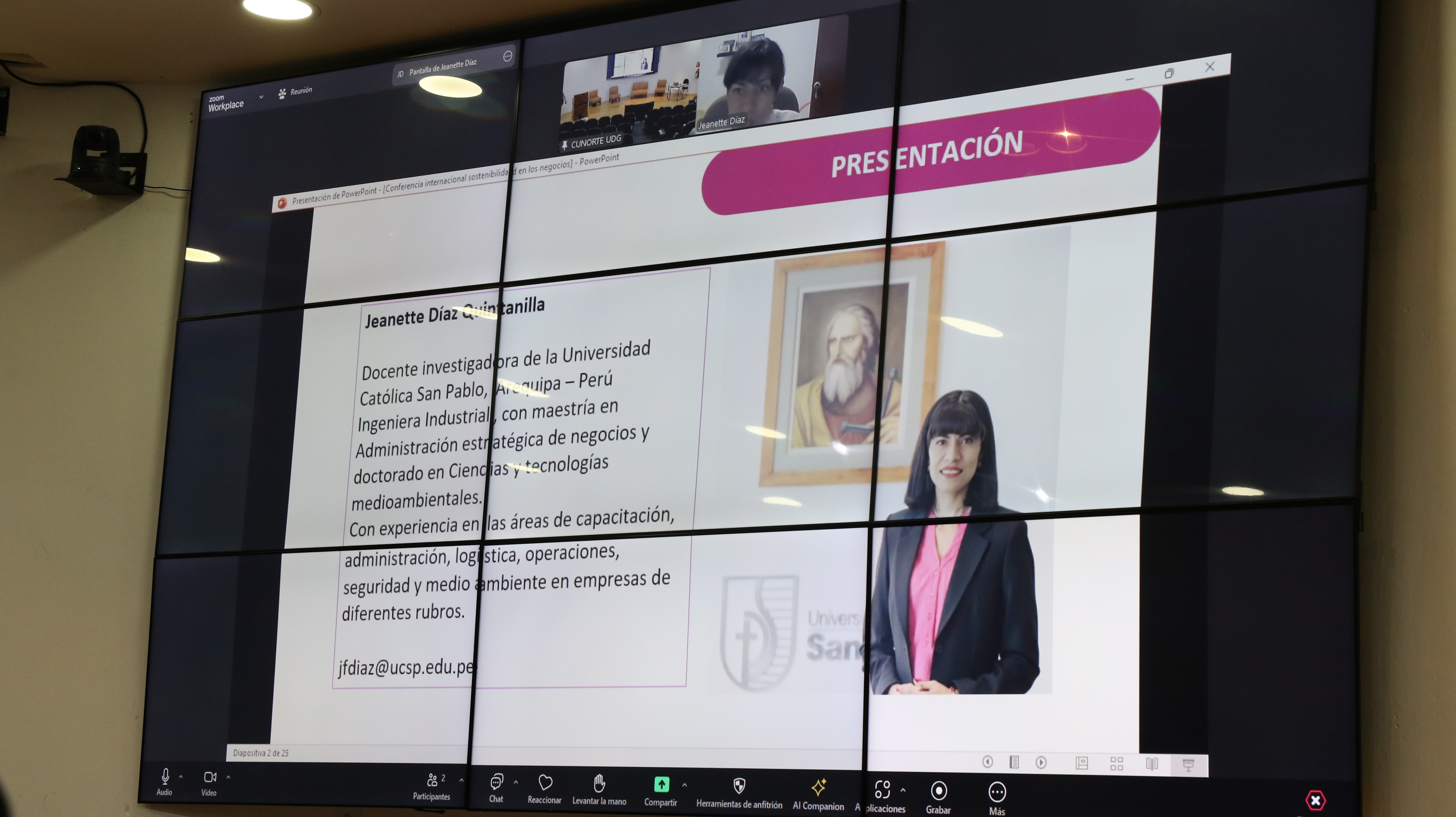 Dra. Jeanette Fabiola Díaz Quintanilla, de la Universidad Católica San Pablo (Perú), con la charla Producción de panel con residuos de marroquinería.