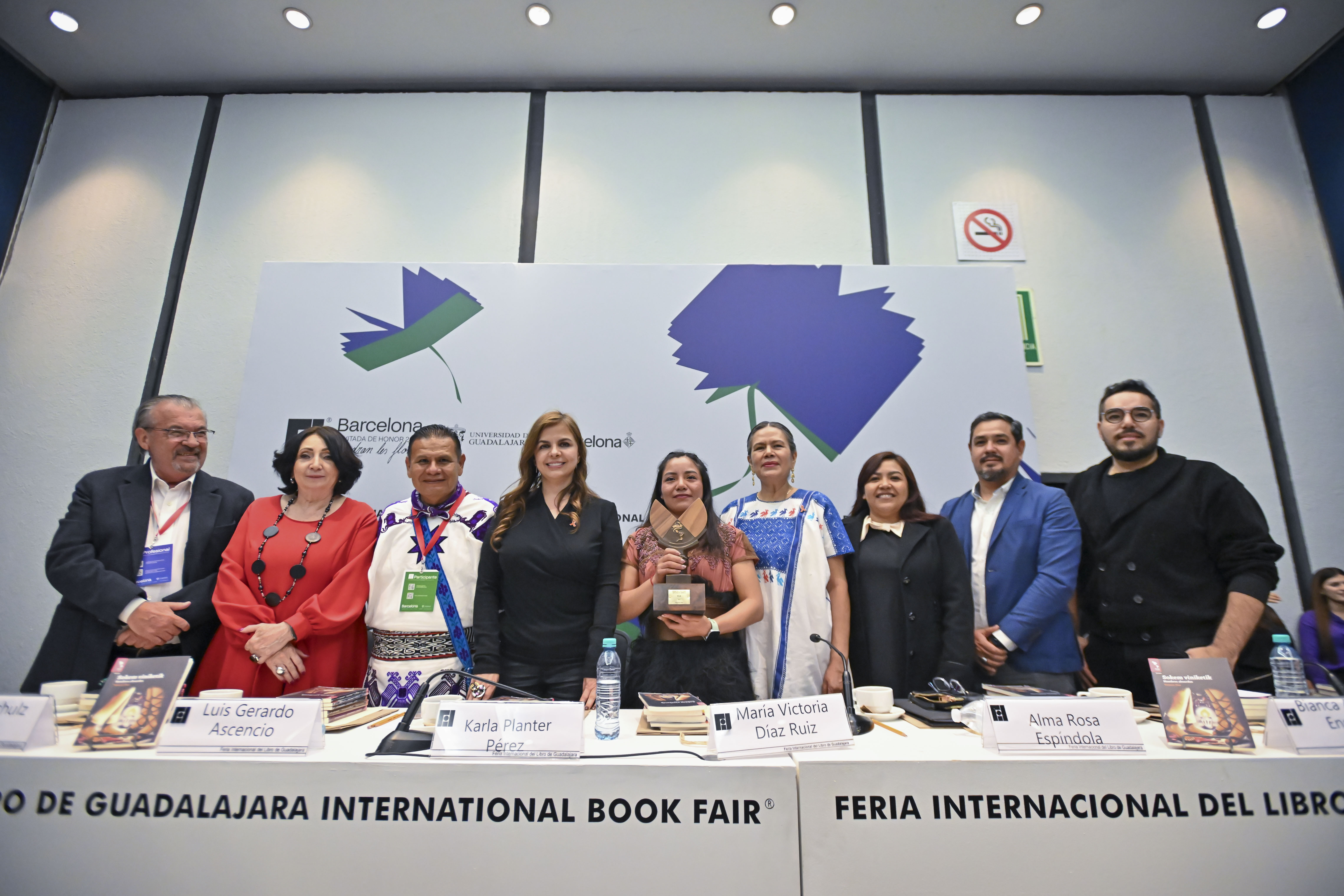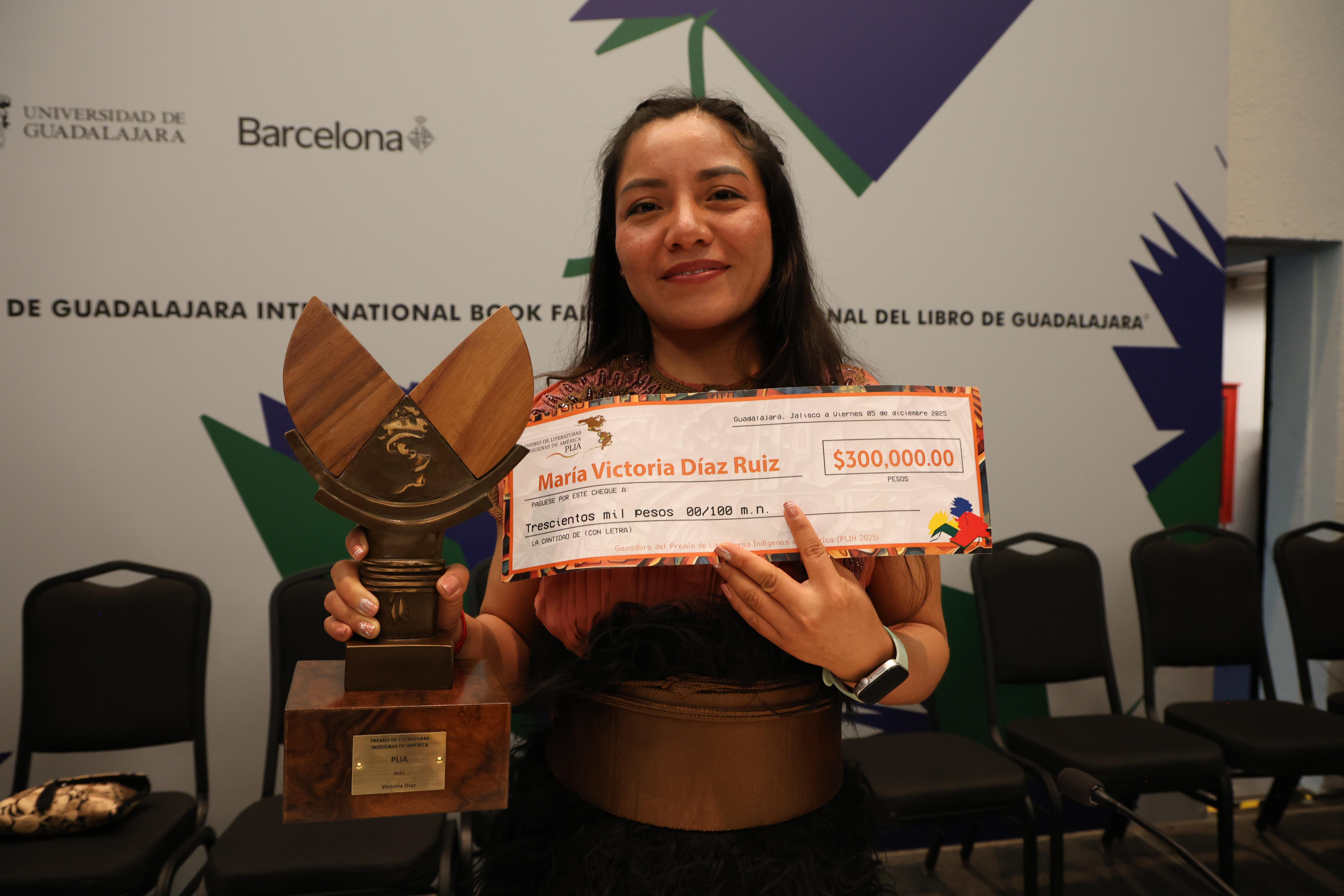 Además del reconocimiento, Victoria Díaz recibió de manos de la Rectora General de la Universidad de Guadalajara (UdeG), maestra Karla Planter Pérez, la estatuilla conmemorativa del PLIA 2025. El galardón incluye además un estímulo económico de 300 mil pesos.