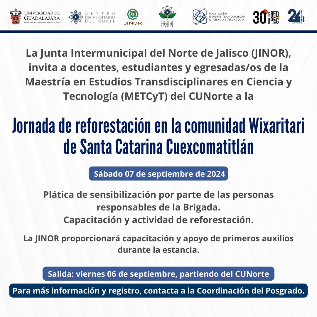 La Junta Intermunicipal del Norte de Jalisco (JINOR), en colaboración con el Centro Universitario del Norte (CUNorte) invita a docentes, estudiantes y egresadas/os de la Maestría en Estudios Transdisciplinares en Ciencia y Tecnología (METCyT), así como a integrantes del Comité de Sostenibilidad, a participar en la Jornada de Reforestación en la comunidad Wixárika de Santa Catarina Cuexcomatitlán.