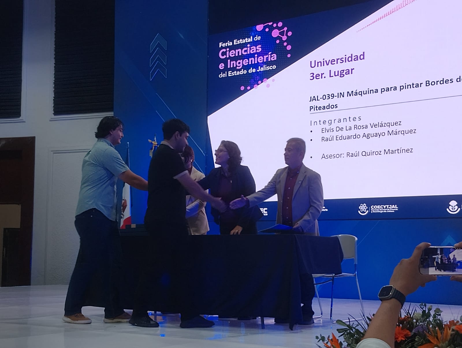 Los alumnos Elvis de la Rosa Vázquez y Raúl Eduardo Aguayo Márquez, de séptimo semestre de la Ingeniería Mecánica Eléctrica del Centro Universitario del Norte (CUNorte), obtuvieron el tercer lugar en la Feria Estatal de Ciencias e Ingeniería de Jalisco (FECIJal) 2025, con el proyecto “Máquina para pintar bordes de cinturones piteados”, desarrollado bajo la asesoría del Mtro. Raúl Quiroz Martínez.